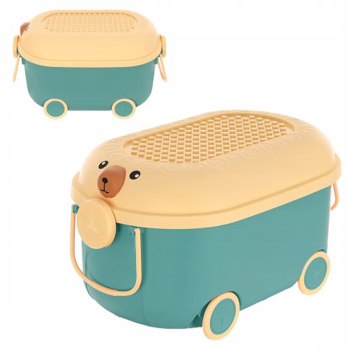 Duży plastikowy pojemnik z pokrywką umożliwia wygodne przechowywanie zabawek i innych rzeczy. Pokrywka ma powierzchnię dostosowaną do klocków lego, którą dziecko może wykorzystać do zabawy. Ponadto pojemnik ma wzór uroczego misia, któr wprowadza przytulny wystrój. Dodatkowe kółka i uchwyt umożliwiają łatwe przemieszczanie, zwłaszcza gdy w środku są cięższe rzeczy.