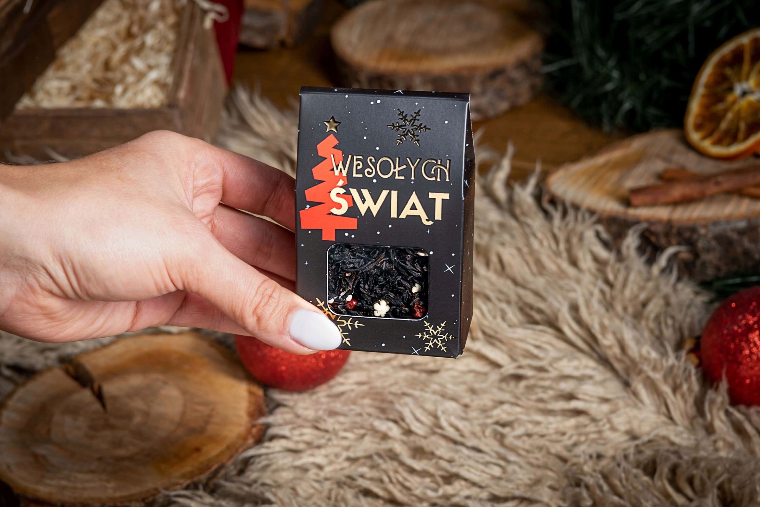 • 2x herbata czarna świąteczna "Wesołych Świąt" w okazjonalnym pudełku marki Green Touch. Wewnątrz każdego pudełka znajdują się dwie duże saszetki z herbatą liściastą, które pozwolą na zaparzenie minimum 4 dużych kubków herbaty (waga orientacyjna 15 g). Składniki: herbata czarna Ceylon, czerwona porzeczka, jarzębina, pieprz czerwony, cukrowe płatki śniegu (cukier, mąka ryżowa, tłuszcz kakaowy, substancja żelująca - tragakanta), aromat.