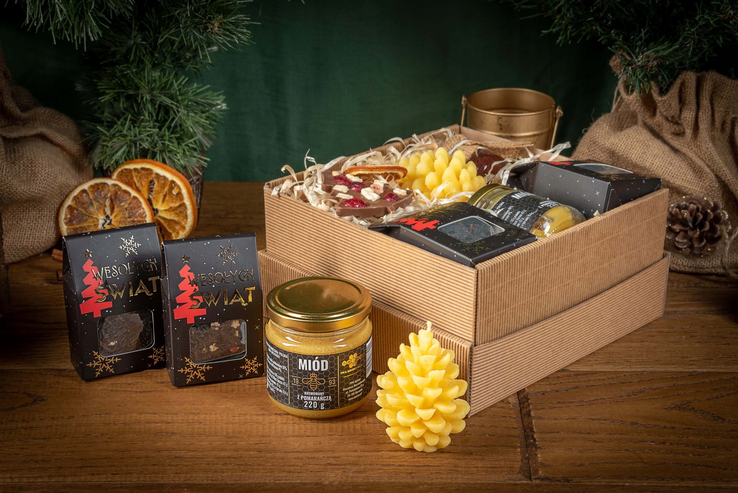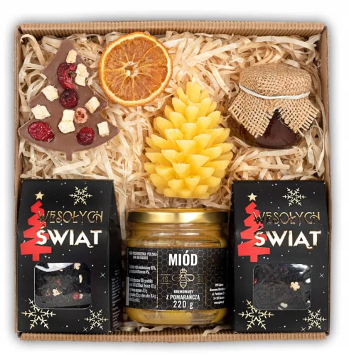 Świąteczny box prezentowy z herbatami, miodami, czekoladą i świecą
