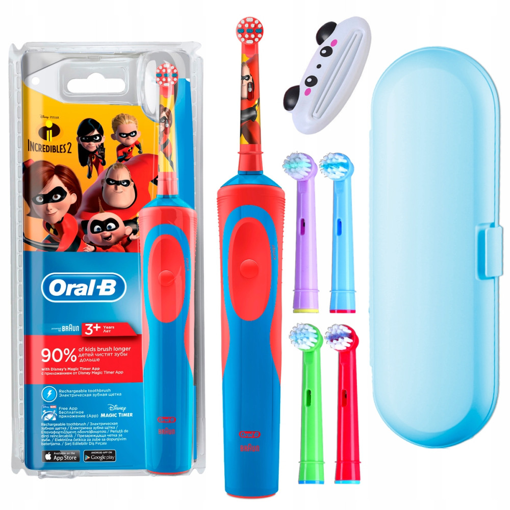 • W skład zestawu wchodzą: szczoteczka elektryczna, ładowarka, końcówka Oral-B, wyciskacz do pasty panda, 4 końcówki zamienniki, etui na szczoteczkę.