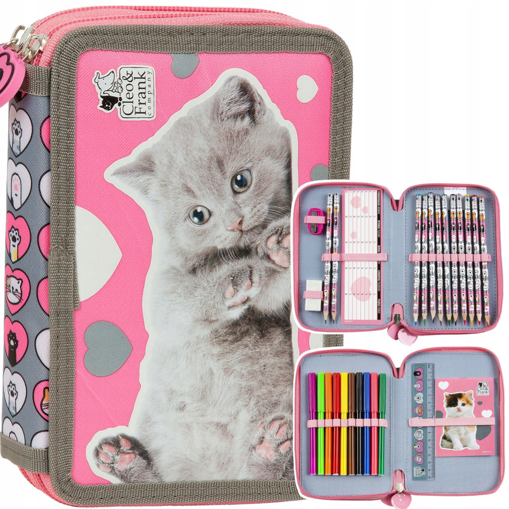Piórnik szkolny 2-komorowy z wyposażeniem Derform dla dziewczynki z kotkiem