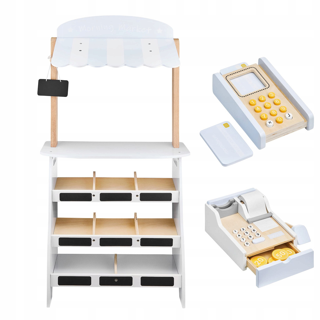 • nazwa przedmiotu: Mamabrum, Supermarket Drewniany Stragan z Akcesoriami, Zabawka dla Dzieci, Sklep Stanowisko Handlowe Café i Shop, 3 lata zabawki, Zestaw zawiera Terminal Płatniczy i Kasę