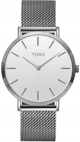Bransoleta z delikatnej stali meshowej w kolorze srebrnym perfekcyjnie komponuje się z okrągłą kopertą, wykonaną również z tego samego materiału. Subtelny biały kolor tarczy zegarka doskonale podkreśla elegancję oraz klasę, jaka towarzyszy kobietom noszącym zegarek Torii. Kombinacja srebrnego koloru bransolety i koperty tworzy harmonijną całość, która dodaje blasku i szyku stylizacji.