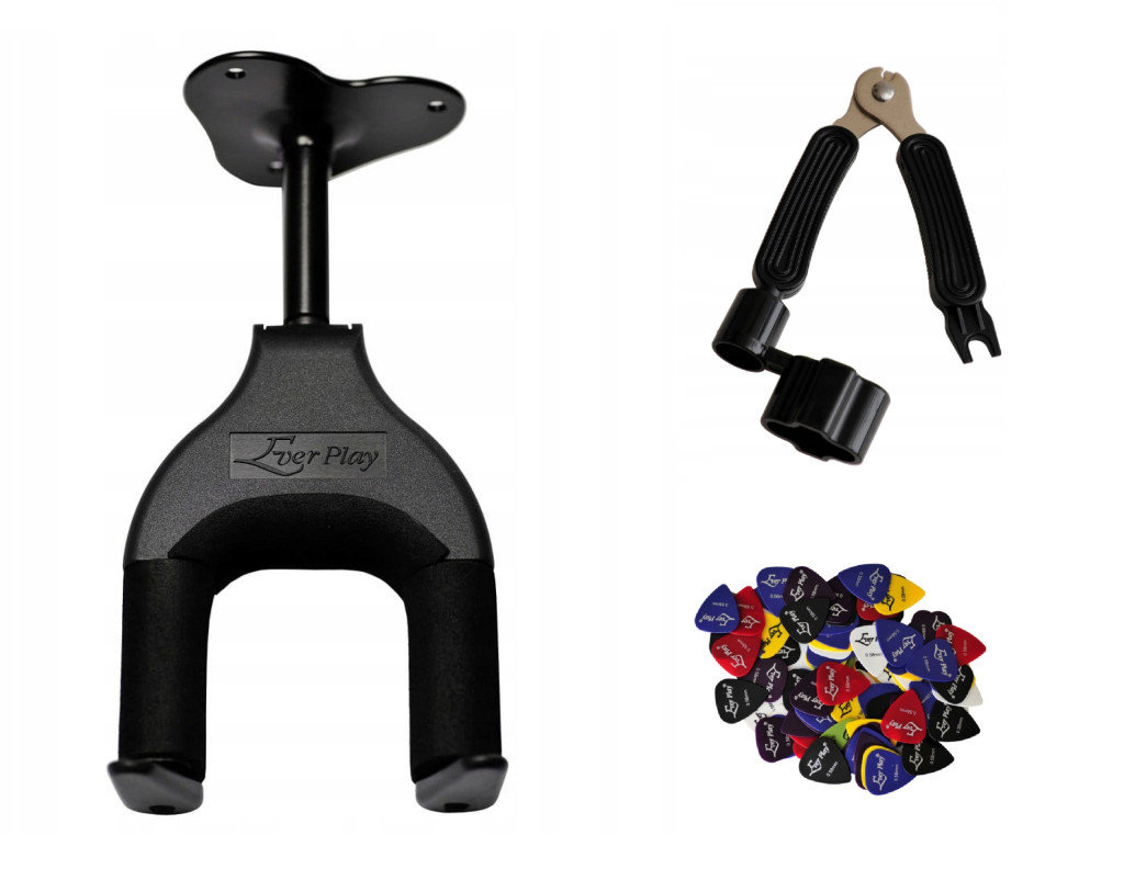 Uniwersalny wieszak gitarowy na ścianę, pasuje zarówno do gitary elektrycznej, jak i akustycznej, klasycznej czy basowej. Specjalna gąbka chroni instrument przed uszkodzeniem, a blokada, która uruchamia się po powieszeniu instrumentu, zabezpiecza go przed przypadkowym upadkiem.