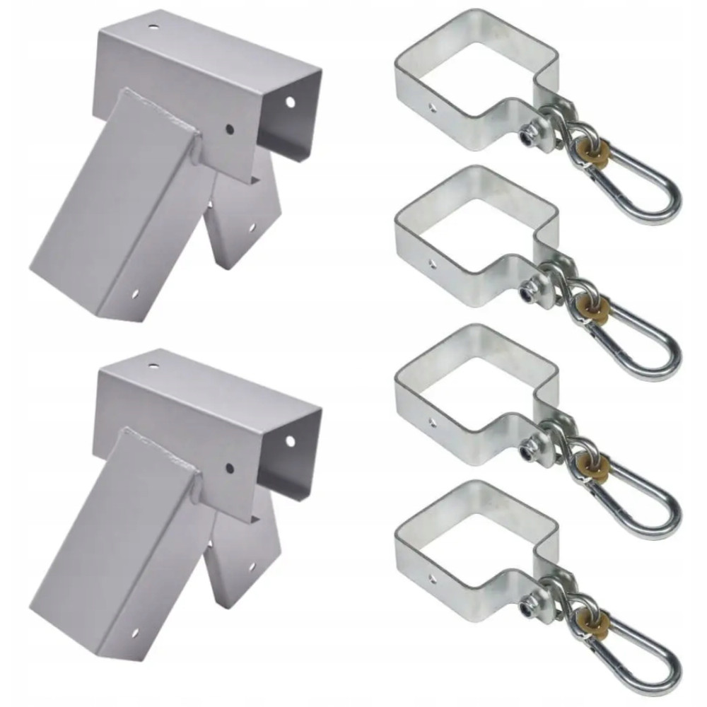 Dzięki tym łącznikom stelaż huśtawki montuje się sprawnie i bardzo łatwo. Nie musisz mieć specjalnych zdolności technicznych. Wystarczy wkrętarka, wkręty do drewna, kilka drewnianych belek i osoba do pomocy, by po chwili cieszyć się stelażem huśtawki. Łącznik 100° oferuje szerszy rozstaw nóg. Konstrukcja taka jest stabilniejsza, ale wymaga więcej przestrzeni. W tym zestawie znajdziesz 2 sztuki łącznika i 4 obejmy do zawieszenia huśtawki.