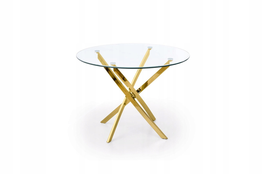 Stół RAYMOND ma okrągły blat z bezbarwnego szkła o średnicy 100 cm, który jest odporny na zarysowania i łatwy w utrzymaniu czystości. Blat wsparty jest na czterech nogach z chromowanej stali w kolorze złotym, które nadają stołowi lekkości i elegancji. Stół pomieści do czterech osób i idealnie pasuje do nowoczesnych wnętrz.
