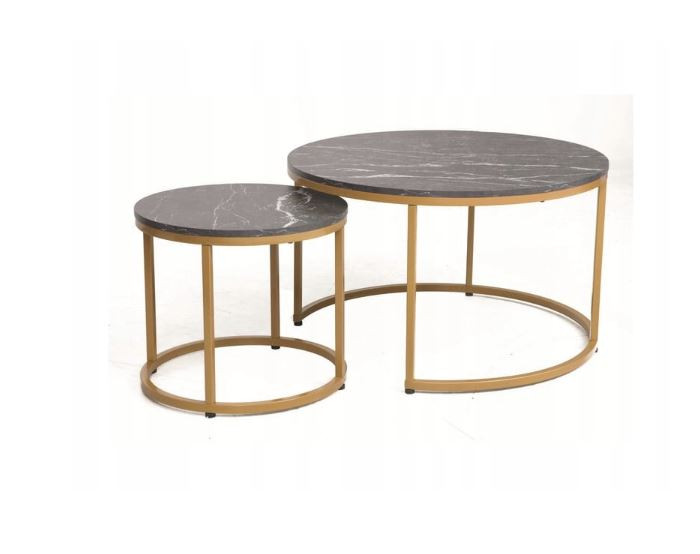 Zestaw ław Dion to dwa okrągłe stoliki od Signal Meble, które nadadzą elegancji i stylu każdemu salonowi. Blat stolików jest wykonany z płyty laminowanej w kolorze czarnym z efektem marmuru, co dodaje im nowoczesnego i glamour wyglądu. Stelaż stolików jest zrobiony z metalu w kolorze złotym, co tworzy idealną oprawę dla blatu i zapewnia stabilność i trwałość mebli. Wymiary stolików są następujące: większy stolik ma średnicę 80 cm i wysokość 48 cm, mniejszy stolik ma średnicę 48 cm i wysokość 42 cm. Maksymalne obciążenie stolików to 40 kg.