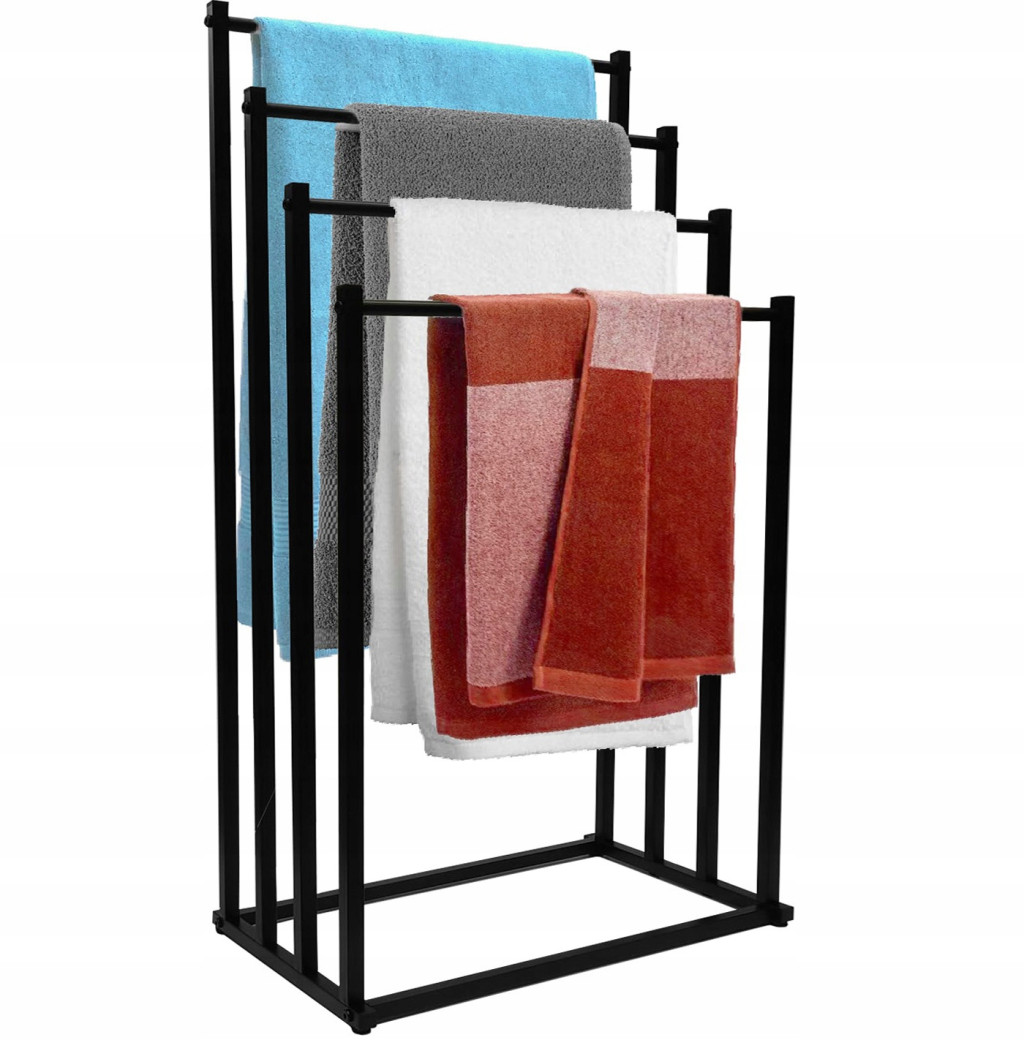 Wieszak łazienkowy stojący czarny na ręczniki to funkcjonalny i stylowy element wyposażenia łazienki.