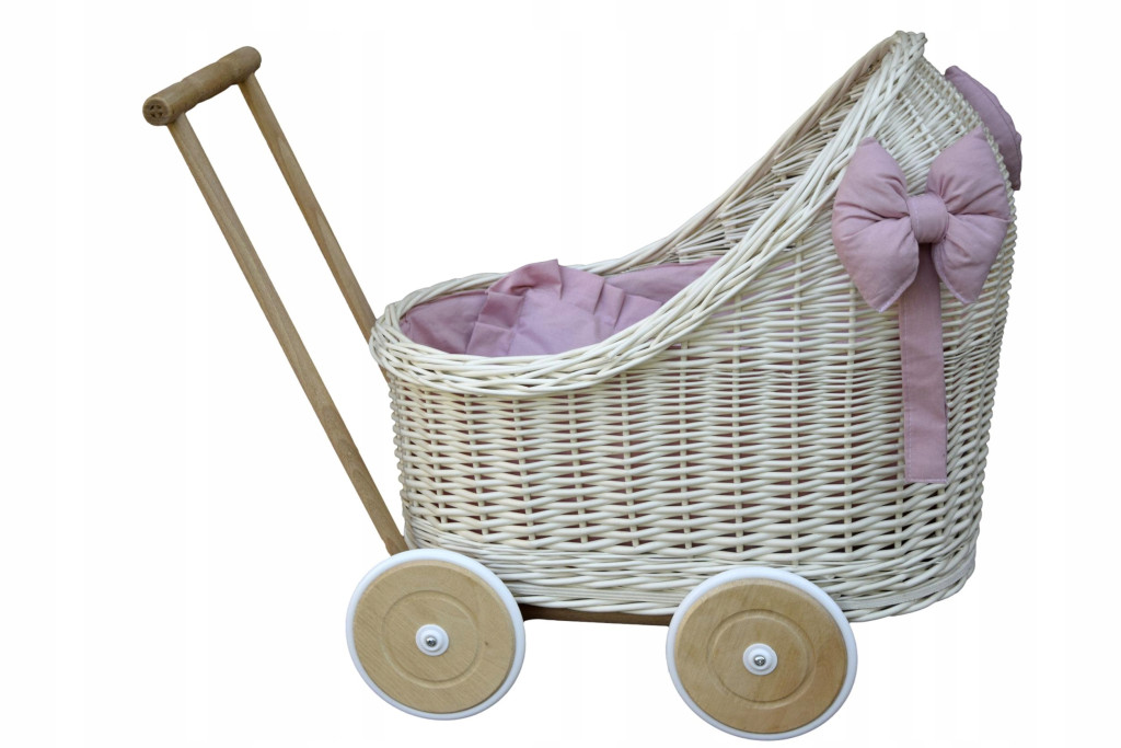 Biały wiklinowy wózek dla lalki z pościelą w kolorze brudny róż - niemalowany biel wpadająca w kremowy - idealna zabawka dla najmłodszych pociech. Może posłużyć do przewożenia lalek, misiów lub innych zabawek.