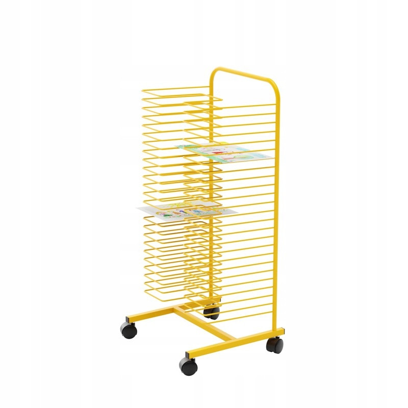 Metalowa suszarka do prac plastycznych. Wyposażona w kółeczka i możliwość regulacji. Stelaż suszarki pokryty lakierem epoksydowym. Suszarka posiada 25 poziomów do ułożenia prac.