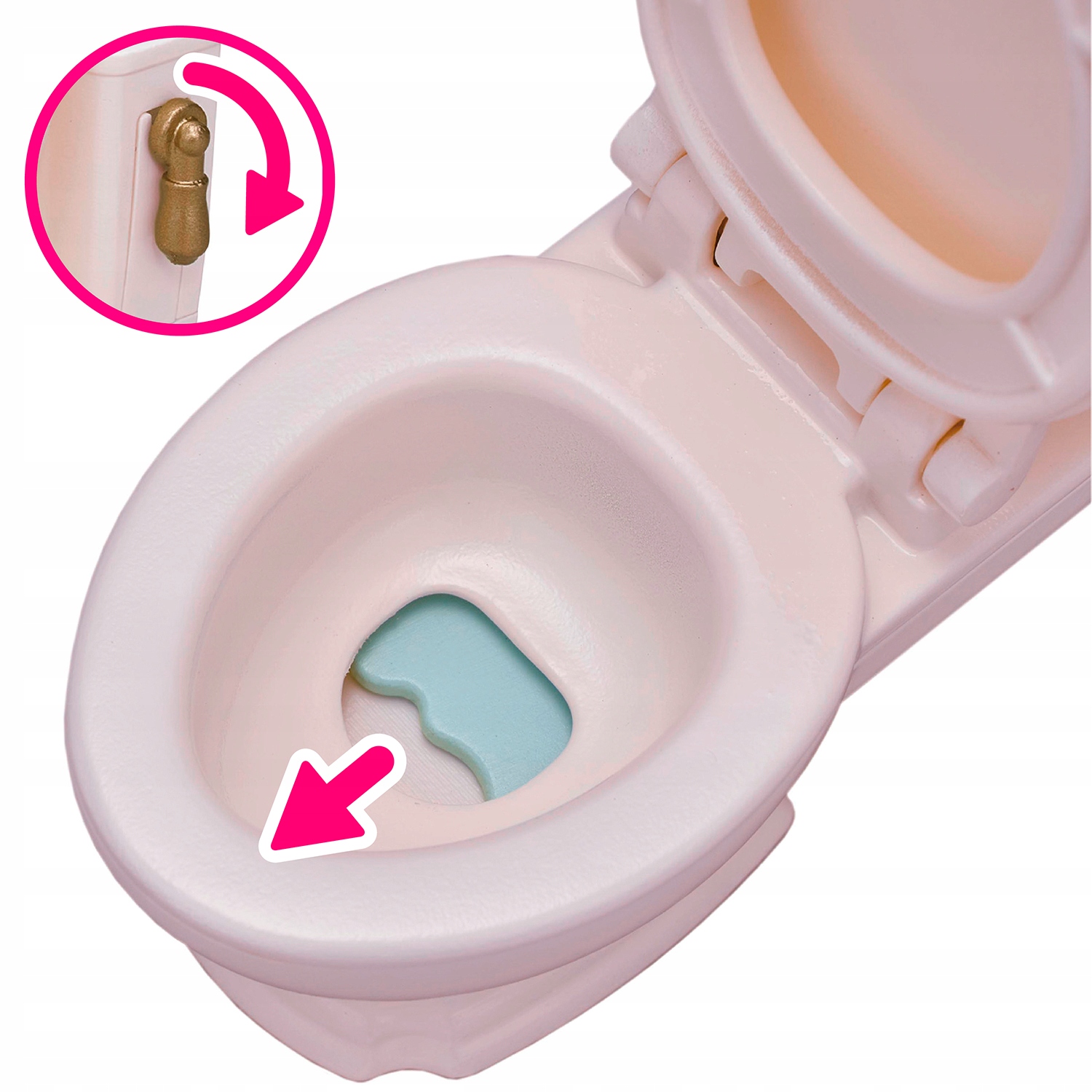 Toaletę można spłukać, pociągając za dźwignię spłuczki, wtedy w muszli pojawia się woda, papier toaletowy można rozwinąć. Figurki Sylvanian Families mogą siedzieć na toalecie. Siedzisko dla dziecka można przymocować do toalety, aby ułatwić dziecku naukę korzystania z sedesu. Umywalka, lustro i uchwyt na papier toaletowy są zamontowane na ściance. Jest nawet miejsce na przechowywanie siedziska na sedes.