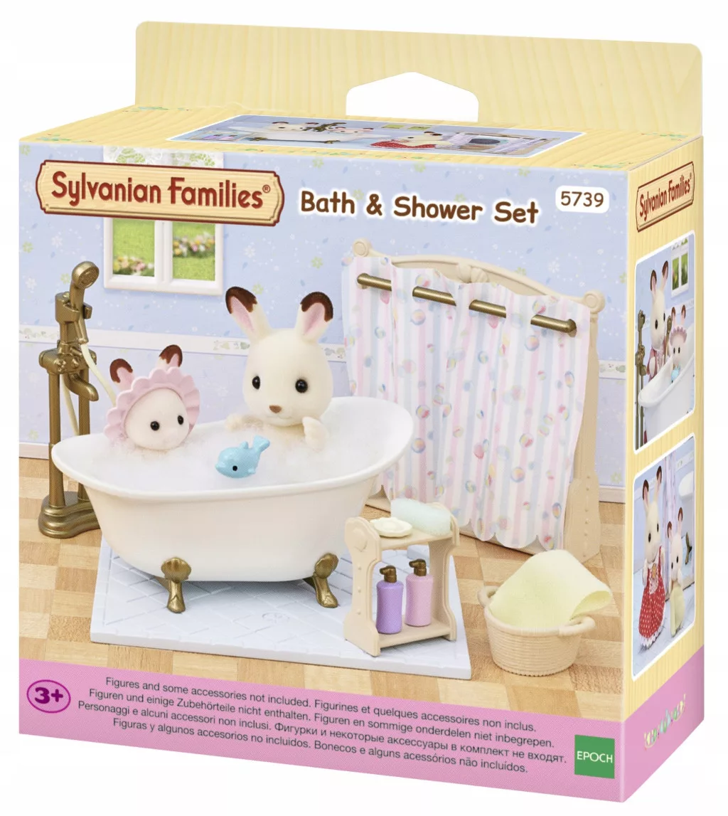 Zestaw Łazienka z wanną i prysznicem zawiera stylową, klasyczną wannę na nóżkach, prysznic, zasłonę pod prysznic, kosz, półkę na akcesoria do kąpieli oraz szampon, mydło, zabawki do kąpieli, czepek pod prysznic i inne akcesoria.