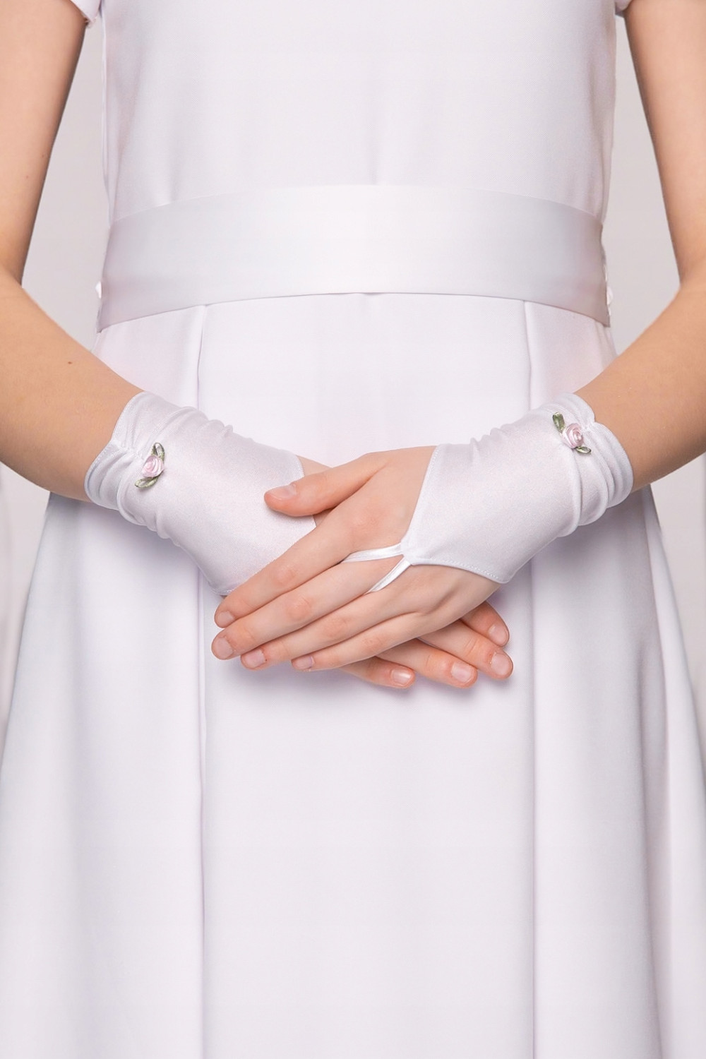 Są białe rękawiczki komunijne dla dziewczynki z różową różyczką.