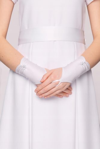 Są białe rękawiczki komunijne dla dziewczynki z kwiatkiem z dżetem.