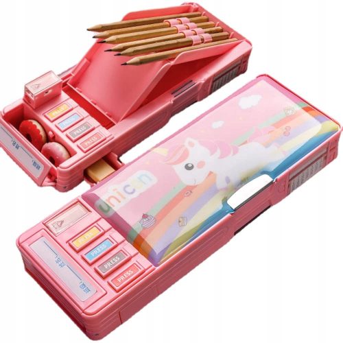 Dwa przyciski na piórniku odpowiednio sterują otwieraniem i zamykaniem lewego i prawego pudełka do przechowywania, dając dzieciom radość z eksploracji.