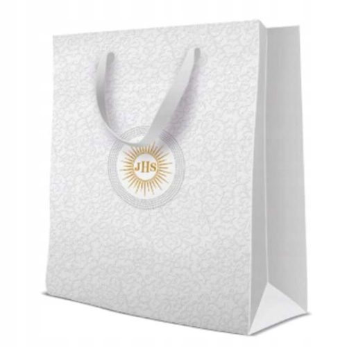Torebka prezentowa z okazji Pierwszej Komunii Świętej. Biała z misternym, koronkowym deseniem oraz złotym symbolem Hostii na środku. Uchwyt z białej tasiemki. Produkt z serii Premium.Standardowy ale i zawsze aktualny wzór w sam raz na upominek dla młodego człowieka w tym szczególnym dniu.