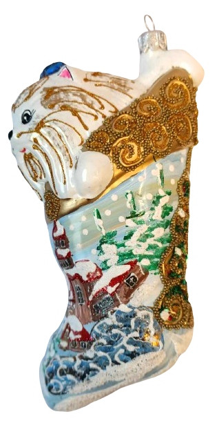 PALLE DI NATALE IN VETRO Cane in calza con paesaggio 18 cm