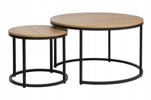Zestaw ław Dion składa się z dwóch stolików o różnych rozmiarach, które możesz dowolnie ustawiać i łączyć ze sobą. Blaty stolików są wykonane z płyty laminowanej w kolorze dębu, która jest odporna na zarysowania i wilgoć. Stelaże stolików są metalowe i malowane na kolor czarny mat, co nadaje im eleganckiego i loftowego charakteru.