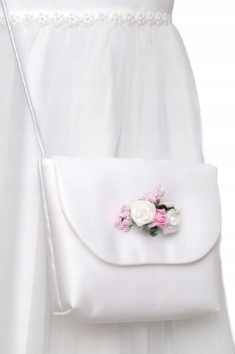 Torebka komunijna uszyta z białej satyny ślubnej na sznureczku atłasowym do przewieszenia przez ramię. Torebeczka jest gładka zdobiona białymi i różowymi kwiatuszkami z różową gipsówką, od środka usztywniana przez co ładnie się prezentuje. Torebka zapinana na rzepa.