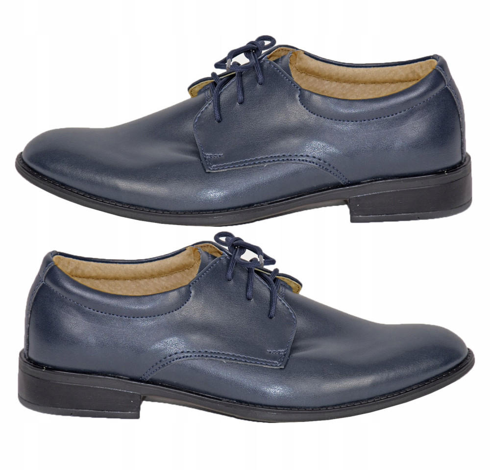 Buty dla chłopca wizytowe, idealne na uroczystości jak Pierwsza Komunia, wesele, czy uroczystości szkolne, buty w kolorze ciemno granatowym, buty mają fason zwężany dzięki czemu mają bardzo męski wygląd, są wygodne, wyściełane naturalną skórą dla większego komfortu noszenia, buty prezentują się świetnie z garniturami z naszej kolekcji.