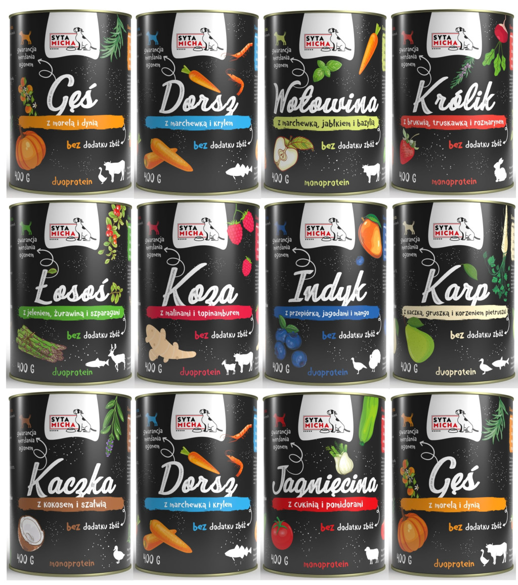 Zestaw zawiera 12 szt. puszek karmy mokrej o gramaturze 400g marki Syta Micha. Wybierz dla swojego psa jego ulubione smaki.