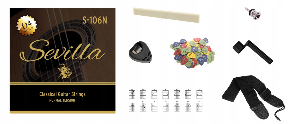 Wybór odpowiednich strun do gitary klasycznej jest sprawą bardzo ważną, ponieważ im lepsze struny tym lepsza jakość dźwięku, a należy pamiętać, że każdy model strun jest inny. Oczywiście nie trzeba kupować najdroższych strun aby cieszyć się pięknym brzmieniem. Przykładem niedrogich strun, które potrafią zachwycić są struny Sevilla S-106N Normal Tension, które brzmią bardzo czysto i naturalnie oraz nie sprawiają problemów z dociskaniem, przez co są także dobrym wyborem dla początkujących gitarzystów. Dodatkową zaletą tych strun jest także zapasowa struna D4.