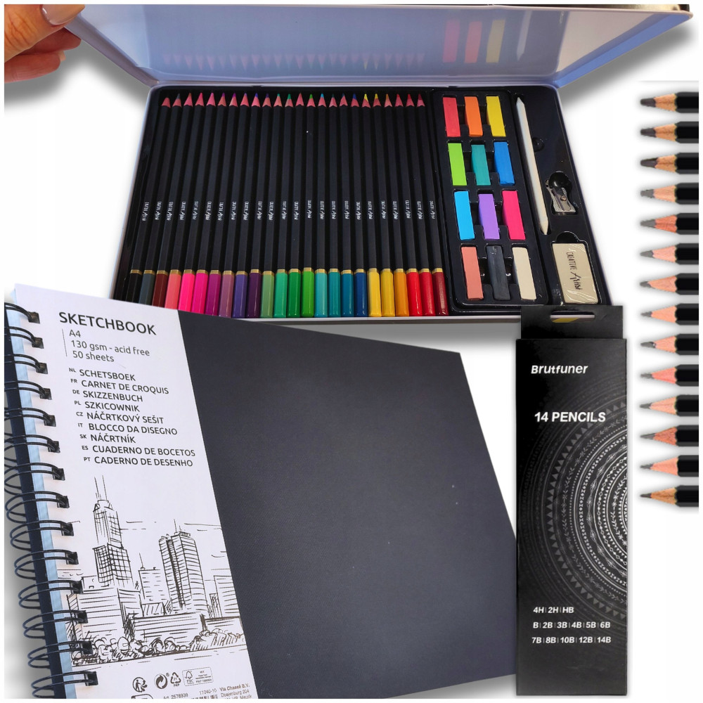 KREDKI PASTELE 39 el SZKICOWNIK A4 OŁÓWKI 14 szt. DO SZKICOWANIA RYSOWANIA