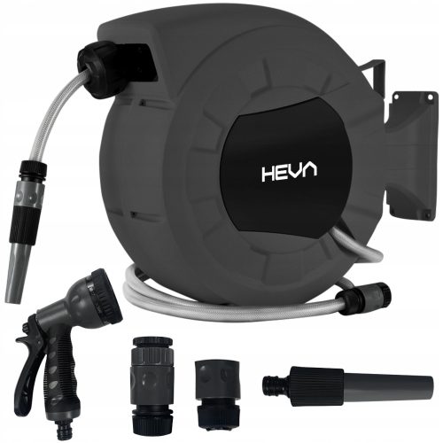 Kupując zwijacz HEVA wszystkie potrzebne elementy otrzymasz w zestawie, dzięki czemu pracę możesz rozpocząć od razu. W zestawie prócz końcówek takich jak dysza spryskującą i pistolet, znajduje się również przyłącze do kranu, złączki oraz wąż przyłączeniowy o długości 1,5m.