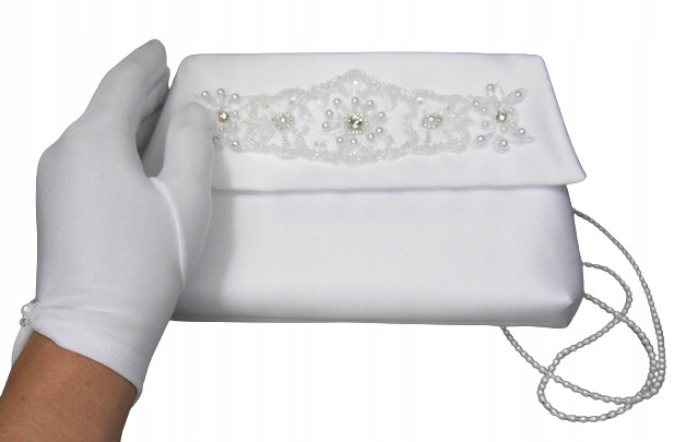 Komplet komunijny. Torebka  z trzech warstw tkanin, satyny ślubnej, sztywnego tiulu i tkaniny cambel. Ozdobiona śliczną koronkową aplikacją z wyszywanymi perełkami, koralikami i cekinami oraz rękawiczki z małymi delikatnymi koralikami. Na pozostałych aukcjach można dopasować do nich okapnik na świece komunijne Na życzenie możemy przygotować rękawiczki zakładane na jeden paluszek.
