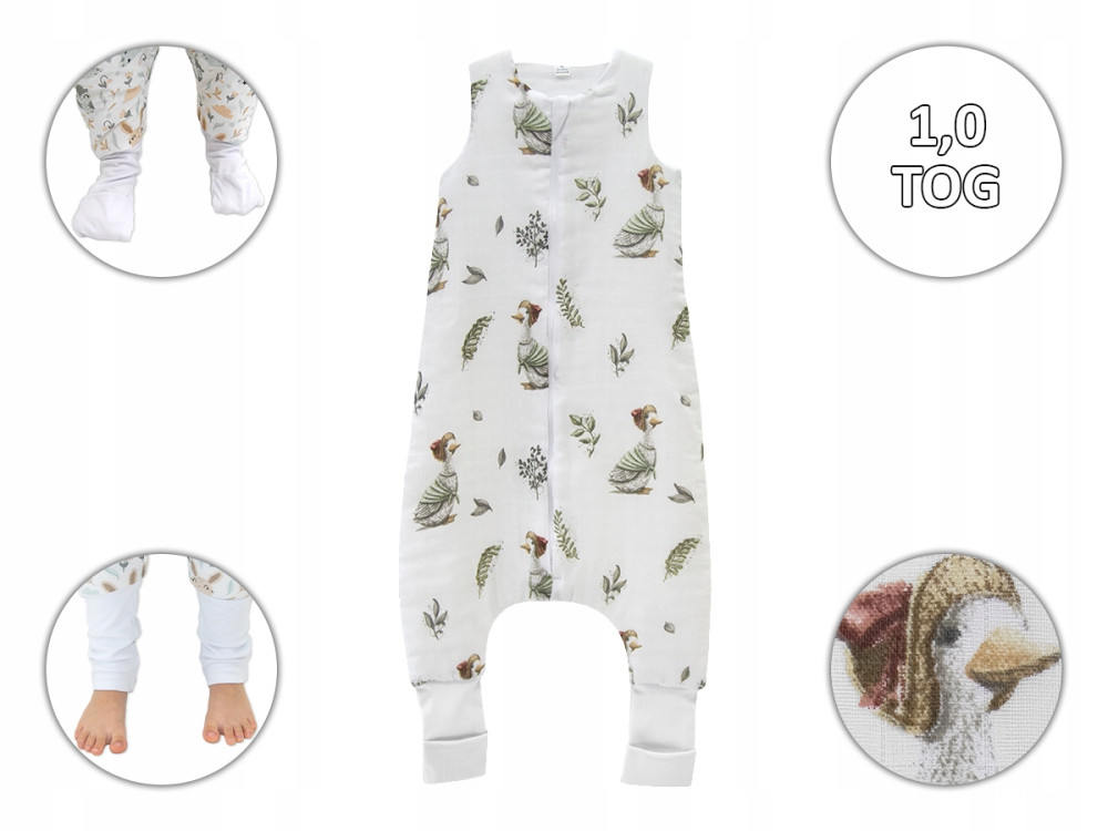 Muślinowy ocieplany śpiworek z nogawkami zakończonymi wywijanymi skarpetkami w rozmiarze S: 68cm - 86cm