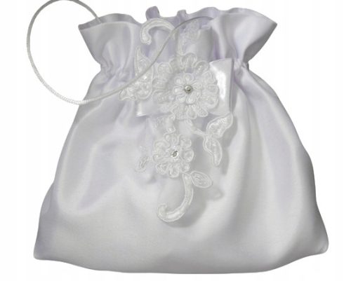 Torebka komunijna wykonana z satyny atłasowej odszyta na matową stronę. Torebka ozdobiona została atłasową kokardką z koronkową aplikacją z akcentem srebra i atłasową cienką rączką.  Na pozostałych aukcjach można do torebki dokupić okapnik na świece komunijne i rękawiczki