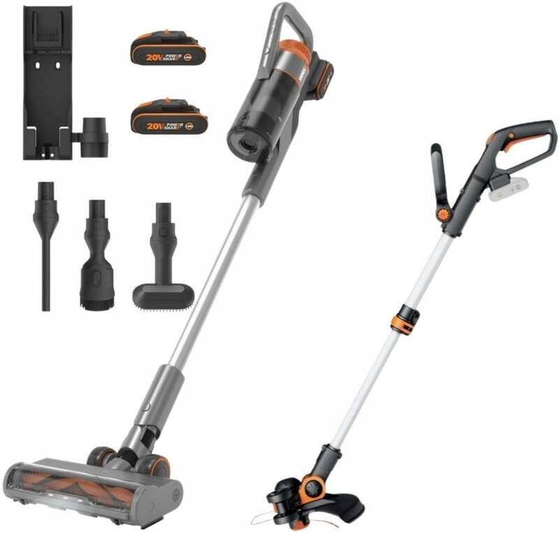 Zestaw Odkurzacz pionowy WORX WX038 2x2Ah bezszczotkowy 25 kPA 56 min LED + Akumulatorowa podkaszarka do trawy WG163E.9 20V