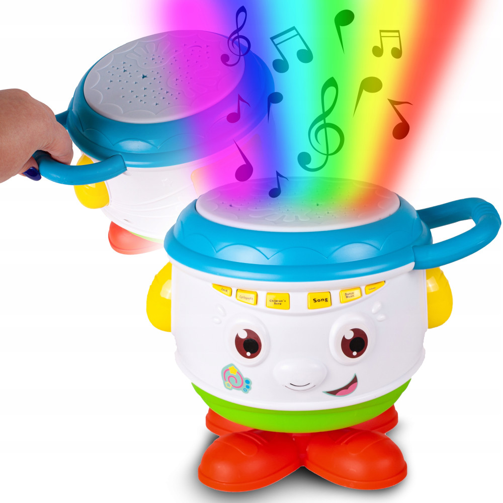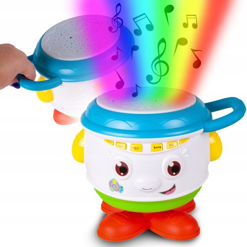 Zabawka rozwija umysł, a także spostrzegawczość dziecka. Po uderzeniu w bębenek, dziecko usłyszy melodię oraz będą się świecić naprzemian diody wewnątrz bębenka, dając piękny efekt.
