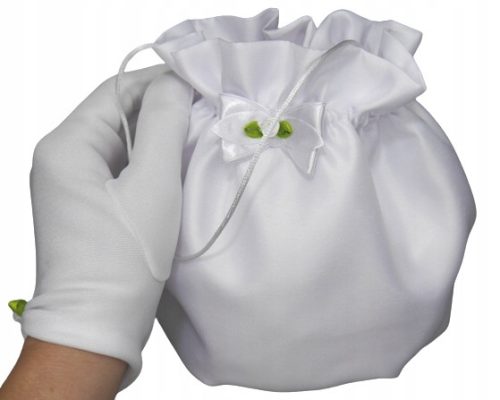 Komplet komunijny: Rękawiczki białe elastyczne ładnie przylegające do dłoni oraz torebka komunijna. Wykonana z satyny atłasowej odszyta na matową stronę. Torebka posiada wkładkę która pomaga w zachowaniu jej kształtu nawet po obciążeniu. Na życzenie możemy odszyć woreczek na atłasową, błyszczącą stronę i przygotować rękawiczki zakładane na jeden paluszek. Na pozostałych aukcjach każdy ten produkt można kupić osobno lub w innym zestawieniu np, z okapnikiem na świecę komunijną.