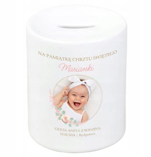 Personalizowana skarbonka z nadrukiem to uroczy prezent na chrzest dla chłopca / dziewczynki, który łączy w sobie praktyczność z sentymentalnym akcentem. Biała porcelanowa skarbonka jest eleganckim i trwałym przedmiotem, który może stanowić piękną pamiątkę z okazji tego wyjątkowego wydarzenia. Skarbonka z nadrukiem staje się w ten sposób nie tylko praktycznym miejscem do zbierania pierwszych oszczędności, ale również wartościową pamiątką z tej ważnej uroczystości.