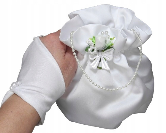 Komplet komunijny w składzie rękawiczki ozdobione perełkami i torebka w kształcie woreczka z satyny ślubnej pierwszego gatunku z perełkowa rączką i ozdobiona przypinką. Torebka posiada wkładkę pomagającą w zachowaniu jej kształtu nawet po wypełnieniu.