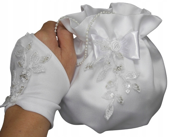 Komplet komunijny w składzie: rękawiczki komunijne zakładane na jeden paluszek, oraz torebka z perełkową rączką wykonana z satyny ślubnej pierwszego gatunku. Zestaw został ozdobiony koronkową aplikacją z naszywanymi koralikami, cekinami i perełkami. Torebka posiada sztywną wkładkę która pomaga w zachowaniu kształtu nawet po obciążeniu. Na pozostałych aukcjach można kupić każdy element zestawu osobno.