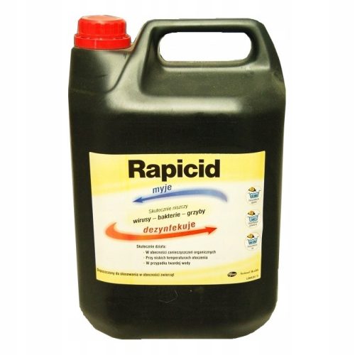 Rapicid to środek na bazie jodu w baniaku przeznaczony do dezynfekcji obiektów inwentarskich. Ze względu na szeroki spektrum działania Rapicid może pełnić również rolę detergentu i służyć do mycia różnego rodzaju powierzchni. Zawartość czynnych związków zawartych w dezynfektancie pozwala łatwo wniknać w powierzchnie porowate i trudno dostępne. Preparat charakteryzuje się niską toksycznością - można stosować go w obecności zwierząt. Środek nie podrażnia dróg oddechowych oraz nie wywołuje alergii u ludzi i zwierząt