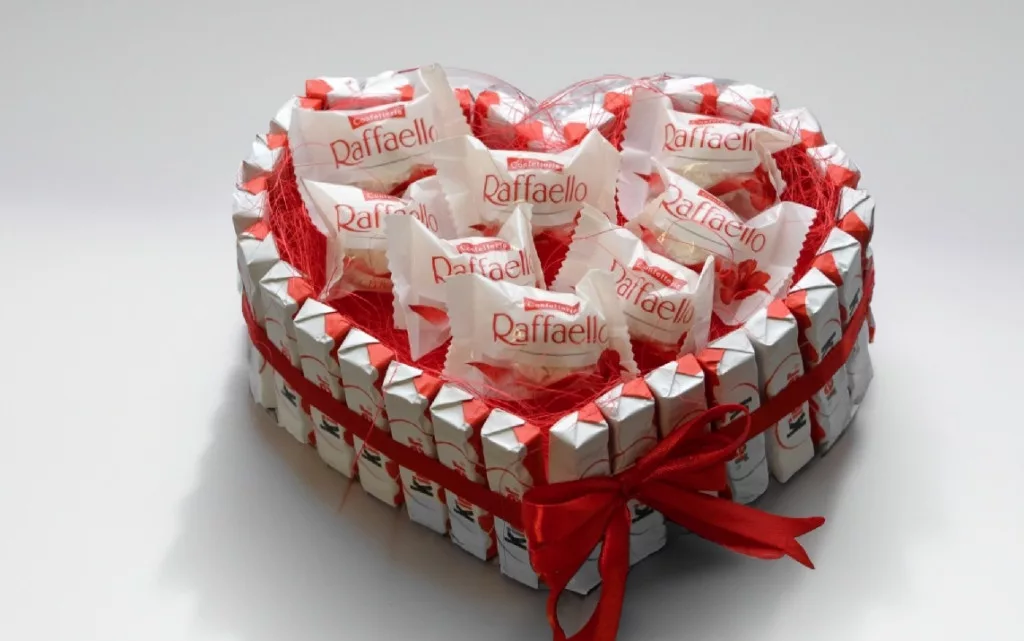 • Rafaello: Dodatkowo, w środku serca znajdziesz pyszne kulki Rafaello, które dostarczą niezapomnianych doznań kokosowego smaku. Konsystencja puszystego kokosowego wnętrza otoczonego delikatną warstwą białej czekolady to prawdziwa uczta dla podniebienia.
