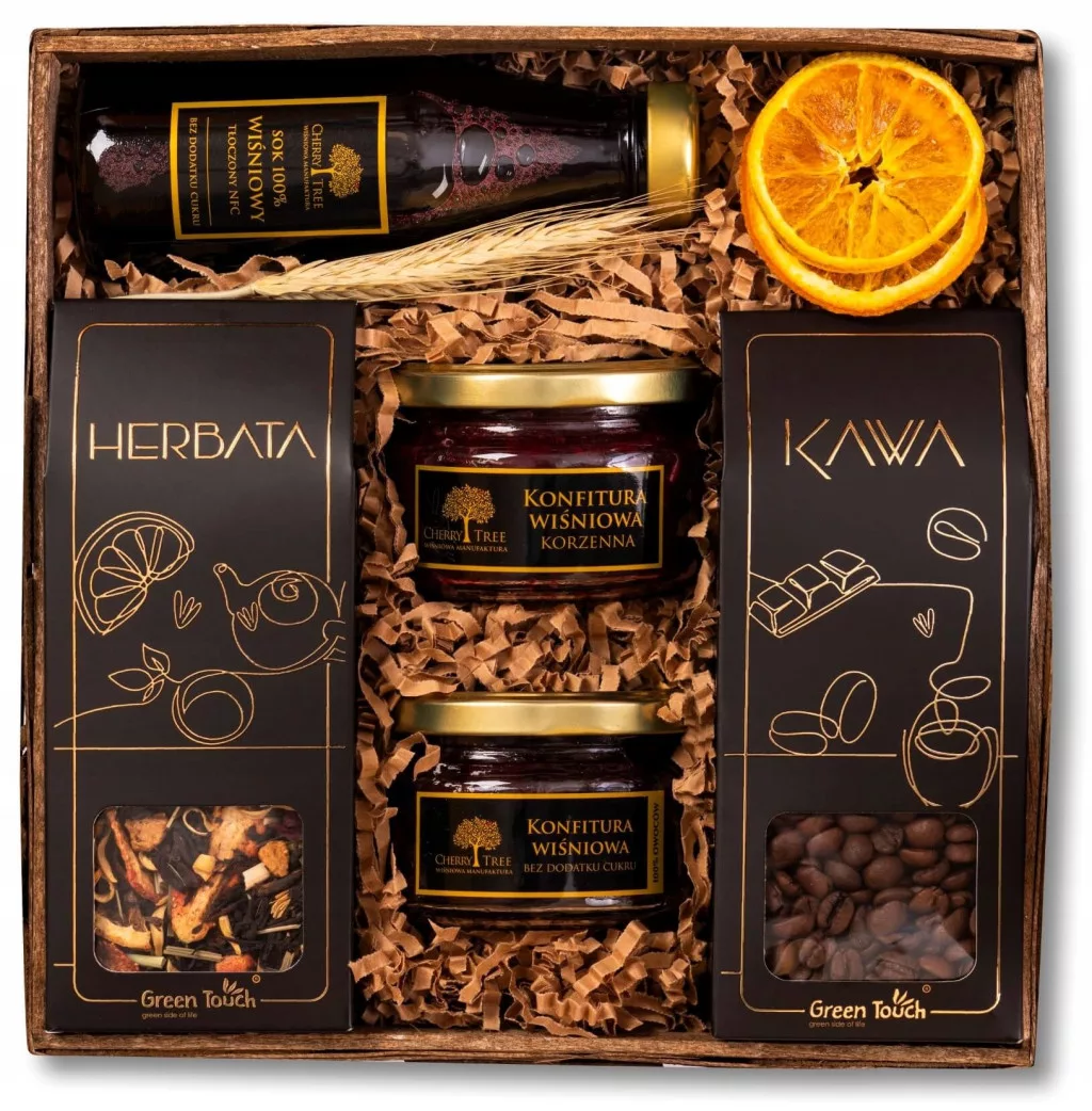 Kosz prezentowy upominek zestaw herbata kawa konfitury wiśniowe i sok nfc