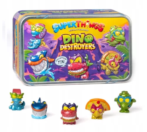Dino Destroyers to wyjątkowa ekipa Super Things, która powstała na skutek inspiracji prehistorycznymi potworami, które przemierzały tereny, siejąc spustoszenie wśród wszystkich mniejszych osobników. Metalowa puszka skrywa 5 ekskluzywnych figurek, przedstawiających kolejno Diplodoofusa, Megalobomba, T-Bite’a, Chocodactyla i Triceratttacka – każdy z nich wygląda jak dinozaur, tyle że ma nieco odmienny kolor skóry czy charakterystyczne elementy wyglądu, które dodają komizmu i sprawiają, że figurki inspirują do dalszej zabawy. Co ważne, cała ekipa bohaterów Dino Destroyers należy do superzłoczyńców, dlatego warto mieć się na baczności, szczególnie że te groźne bestie potrafią wyrządzić wiele szkód!