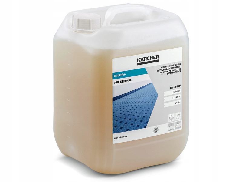 Szybkoschnący środek czyszczący CarpetPro RM 767 OA marki KARCHER. Jest gotowy do natychmiastowego użycia i wysycha do 50% szybciej niż inne środki do gruntownego czyszczenia, dzięki czemu jest idealny dla profesjonalnych wykonawców usług budowlanych czyszczących obszary o dużym natężeniu ruchu. Niezawierający fosforanów detergent do jednostopniowej ekstrakcji natryskowej może być stosowany z urządzeniami ekstrakcyjnymi Puzzi, jak również z urządzeniami do czyszczenia wykładzin (BRC). Zapewnia, że powierzchnie są szybko gotowe do ponownego użytkowania, niezawodnie usuwa olej, tłuszcz i zanieczyszczenia mineralne, pochłania przenikliwe zapachy, takie jak dym tytoniowy lub tłuszcz kuchenny oraz poprawia higienę tapicerki i pokryć podłogowych. Właściwości te sprawiają, że szybkoschnący środek czyszczący CarpetPro RM 767 OA jest idealny do czyszczenia wykładzin, mebli tapicerowanych lub foteli samochodowych, a także innych pokryć tekstylnych w pojazdach.