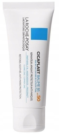 Kojący balsam regenerujący Cicaplast Baume B5 SPF50 La Roche-Posay zapewnia kompleksową pielęgnację podrażnionej skóry, pomaga odbudować jej barierę ochronną oraz zabezpiecza ją przed szkodliwym działaniem promieni UV. Może być stosowany na skórę świeżo wytatuowaną, a także po peelingach chemicznych i zabiegach kosmetycznych z użyciem lasera. Balsam przynosi ulgę podrażnionej skórze, zmniejszając zaczerwienienie, uczucie pieczenia oraz mrowienia.