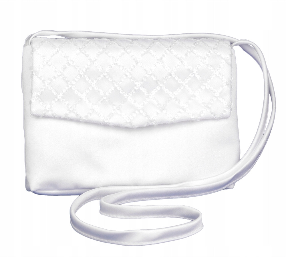 Satynowa torebka komunijna pełna subtelnego blasku. Klapka ozdobiona warstwą tiulu haftowanego lśniącymi, przezroczystymi cekinami. Model do noszenia na ramieniu.