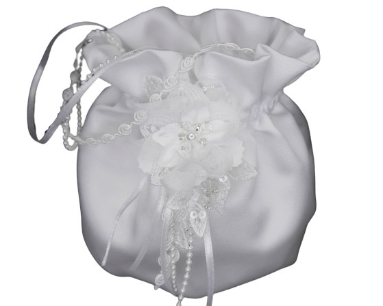 Torebka komunijna w kształcie woreczka wykonana z satyny ślubnej wysokogatunkowej ozdobiona  koronkową aplikacją 3D. Torebka posiada usztywnianą wkładkę pomagająca zachować  kształt nawet po obciążeniu. Na pozostałych aukcjach można do niej dobrać np. okapnik na świecę czy bransoletkę ozdobione taką samą aplikacją.