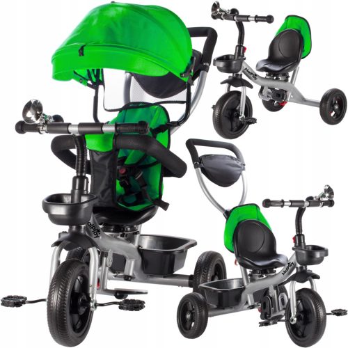 1. Jako wózek spacerowy (rowerek z pełnym wyposażeniem): poręcze zabezpieczają dziecko, budka osłania przed słońcem, opiekun za pomocą rączki prowadzi i steruje rowerkiem. Siedzisko można obrócić przodem lub tyłem do kierunku jazdy, w zależności od preferencji malucha i rodzica.