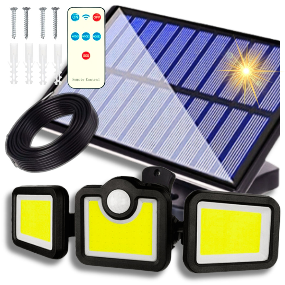 Lampada LED SOLARE 3in1 SENSORE MOVIMENTO E CREPUSCOLARE SET REMOTO, CAVO 5M
