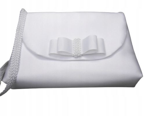 Satynowa torebka komunijna z trzech warstw: sztywnego tiulu, satyny atłasowej i wierzchnia warstwa z satyny ślubnej pierwszego gatunku. Torebka ozdobiona została rypsową kokardką z jedwabnym plecionym sznurkiem. Do torebki przygotowaliśmy rękawiczki, okapnik na świecę komunijną oraz opaskę dostępne na naszych pozostałych aukcjach.