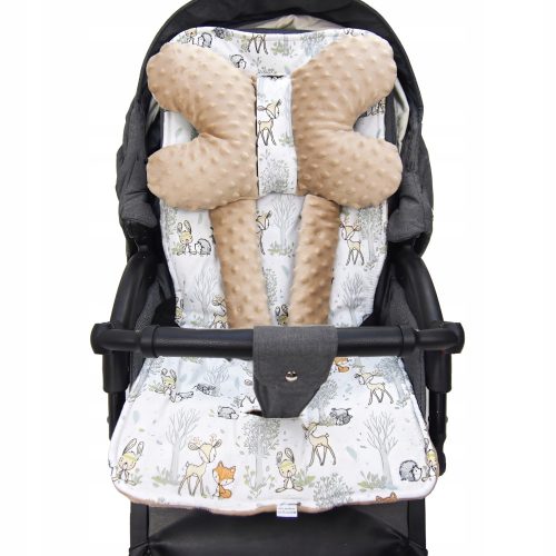 Posiada 6 otworów na pasy oraz dwa dodatkowe otwory na mocowanie poduszki. Pasuje do większości rodzajów wózków. Wkładkę można prać w pralce w temp. 40 stopni.