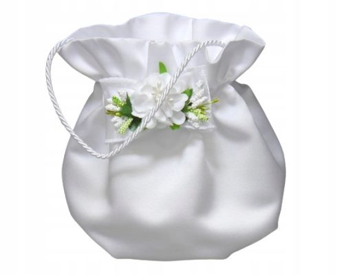 Urocza torebka komunijna w kształcie woreczka. Ozdobiona przypinką. Torebka wykonana została z satyny ślubnej pierwszego gatunku i posiada  wkładkę pomagającą w zachowaniu kształtu woreczka nawet po obciążeniu. Na pozostałych aukcjach można do niej dopasować rękawiczki pięciopalczaste lub zakładane na jeden paluszek oraz okapnik i wianek komunijny